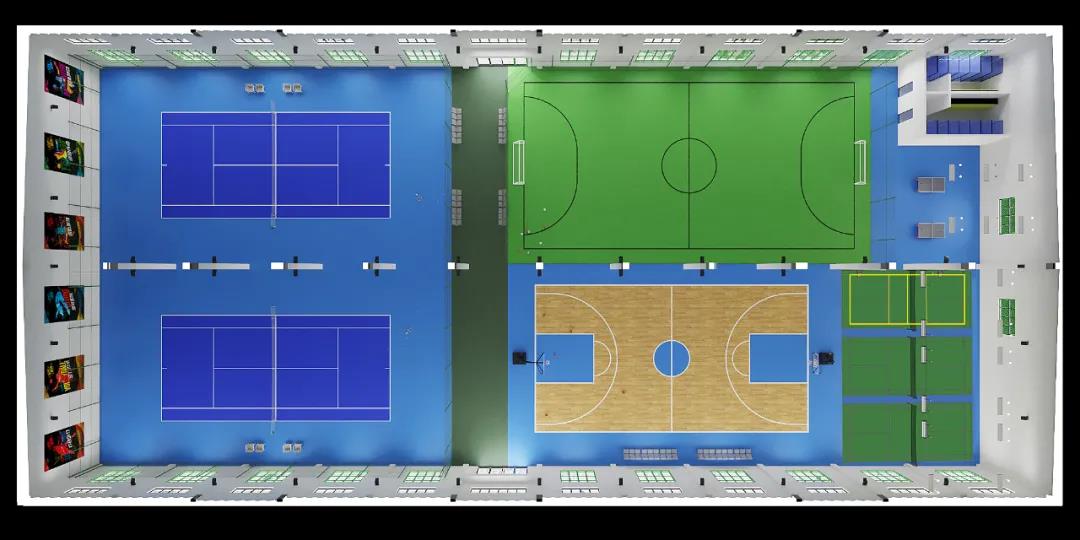 整個場館包含了網球場,五人制足球場,籃球場,乒乓訓練場,羽毛球場