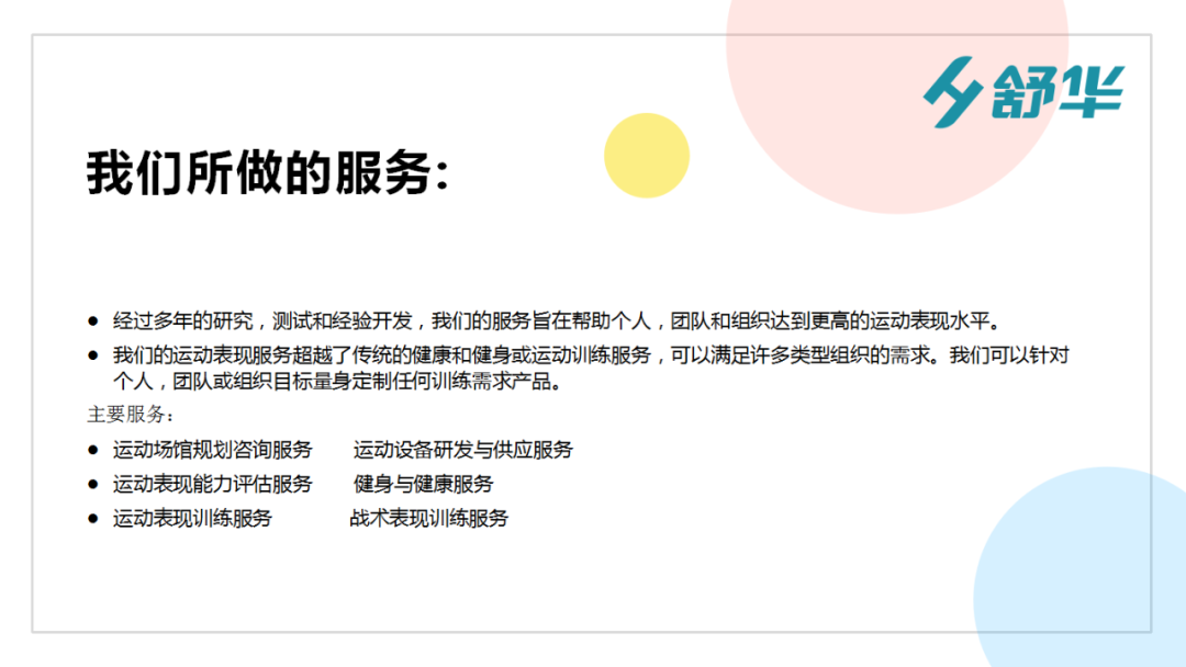隨著社會對體能訓練需求的日益增加,舒華成立了體能專業團隊,團隊成員來自世界各地,他們由國際認證體能教練、運動表現專家、物理治療師、注冊營養師、體育心理學家組成,擁有深厚的專業知識及豐富經驗。可以針對個人,團隊或組織目標量身定制任何訓練需求產品。主要服務:運動場館規劃咨詢服務,運動設備研發與供應服務,運動表現能力評估服務, 健身與健康服務,運動表現訓練服務,戰術表現訓練服務等。
