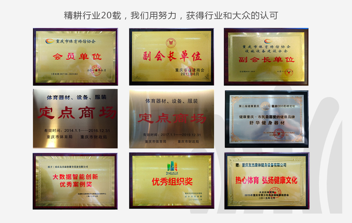 圍繞“全面智能 、全民健康”的主題,友杰體育的業務范疇囊括家庭健身、商用健身、全民健身、校園體育、場地場館、專業體能六大領域,精心構建全場景、全人群、全智能的運動藍圖。秉持“超越客戶預期”的服務準則,友杰堅守企業與客戶、員工、行業協同共進的理念,持續發展壯大,連續多年榮膺重慶市場占有率及銷售額雙冠的高端健身設備與體育設施供應商殊榮,并先后獲得“重慶市優秀體育企業”、“重慶市體育局、財政局定點采購單位”、“重慶市體育產業示范單位”、“政采云優選品牌供應商”等諸多榮譽。